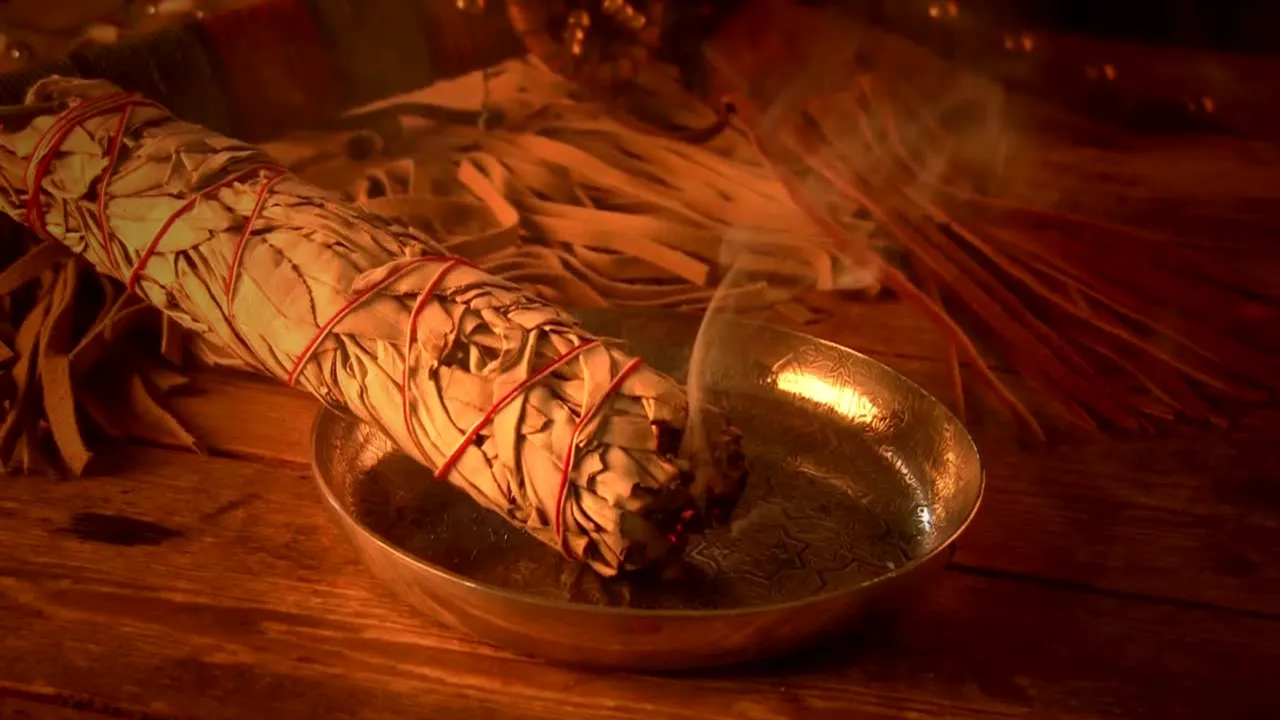 1. Light the tip of a dried sage bundle until it begins to smoke.